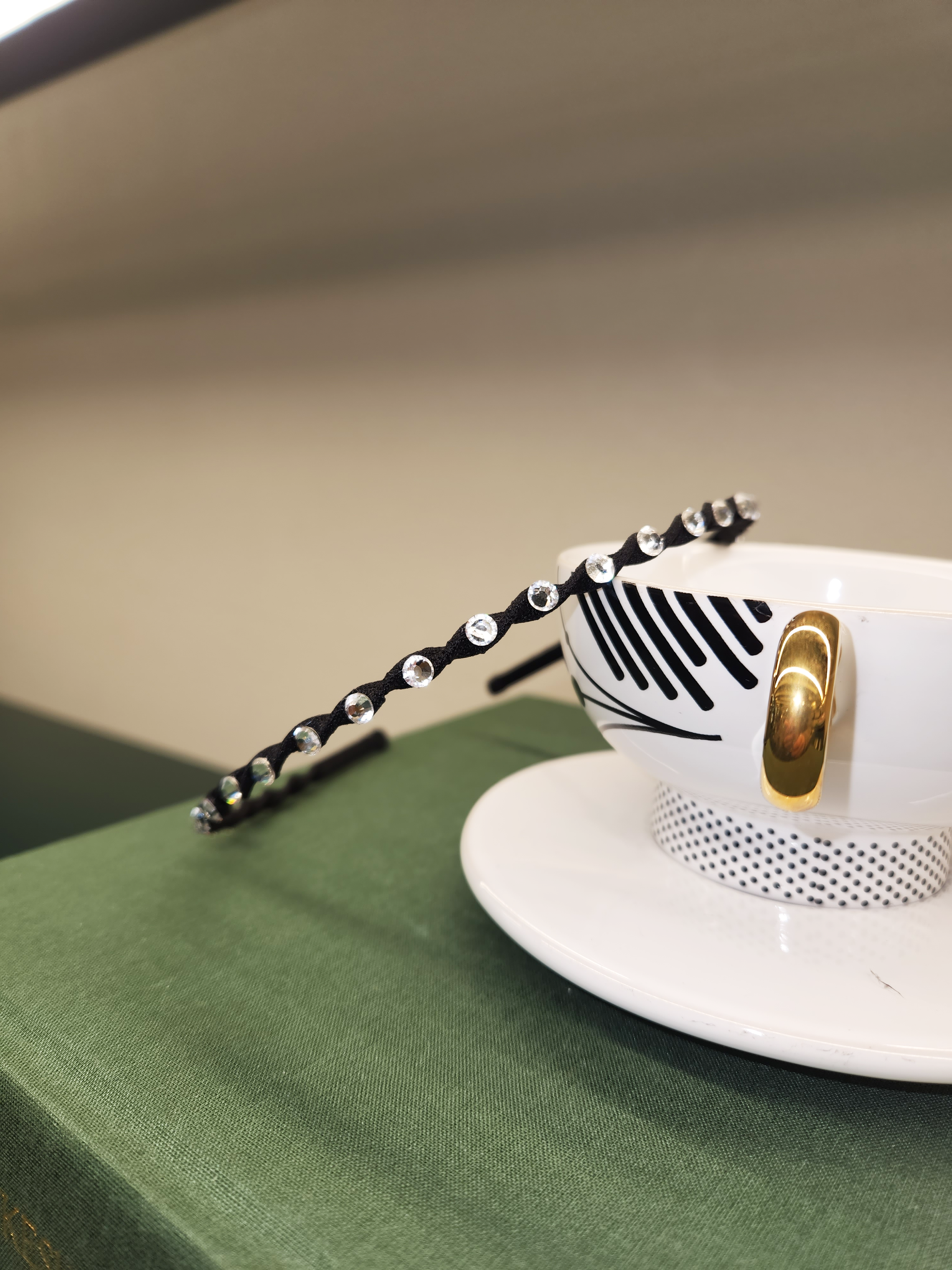 Dette elegante hårbåndet med krystalldetaljer er den perfekte tilbehøret for å lyse opp håret ditt. Den delikate designen, prydet med glitrende krystaller, gir en sofistikert touch til enhver frisyre.