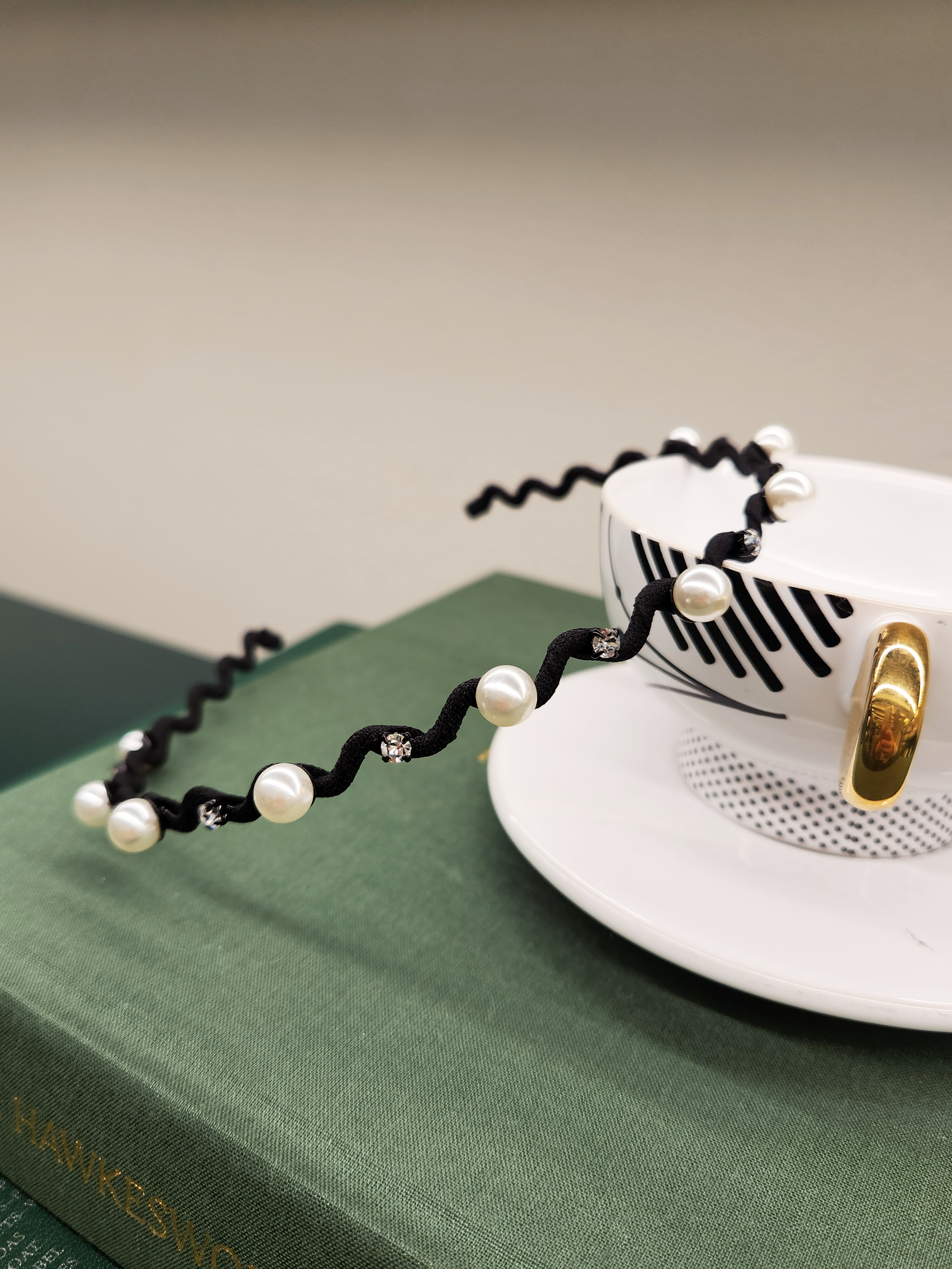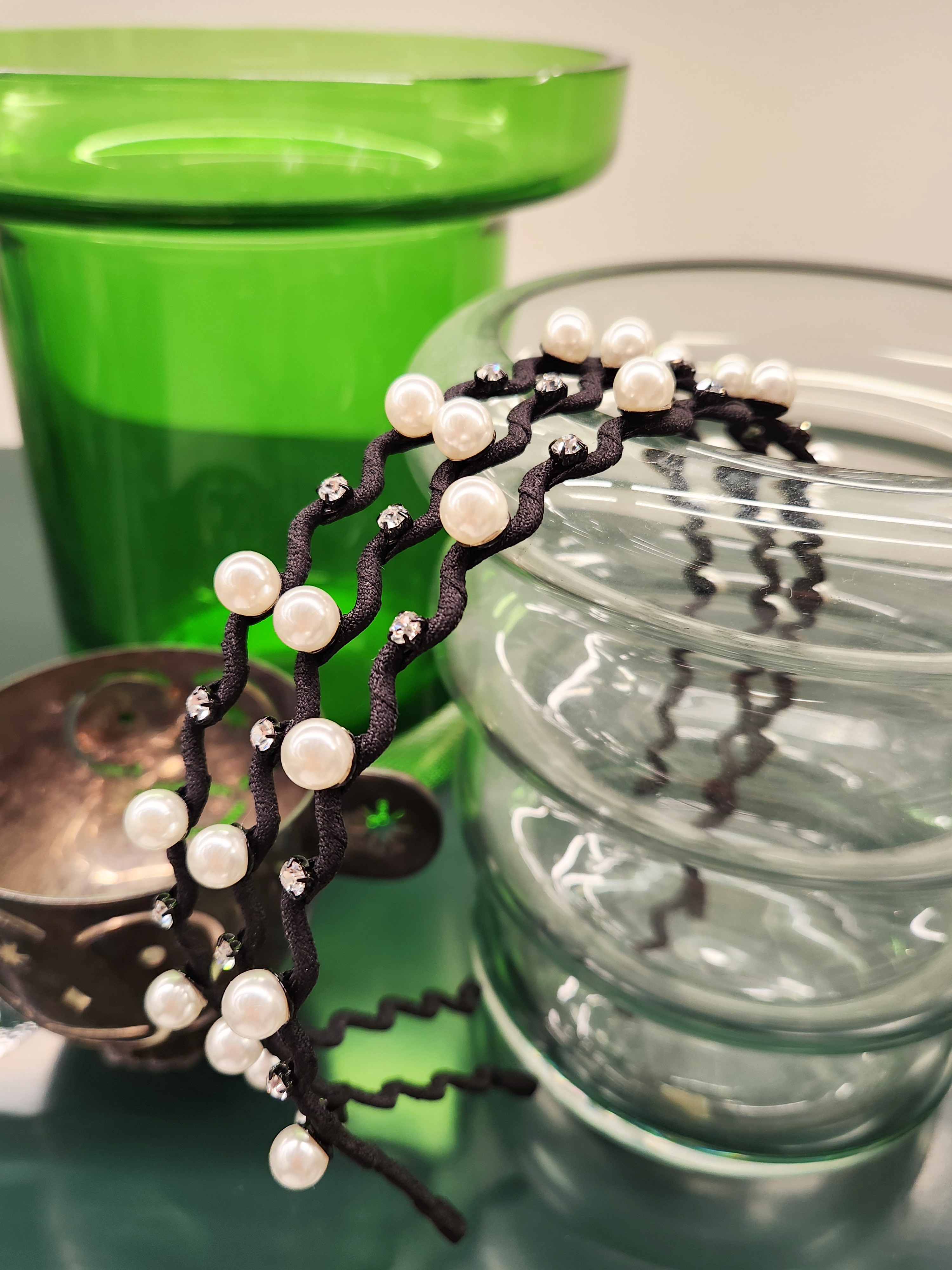 Dette elegante svart hårbåndet er pyntet med glitrende krystaller og vakre perler, som gir et sofistikert preg til enhver frisyre. Hårbåndet kombinerer stil og komfort, noe som gjør det ideelt for både hverdagsbruk og spesielle anledninger.