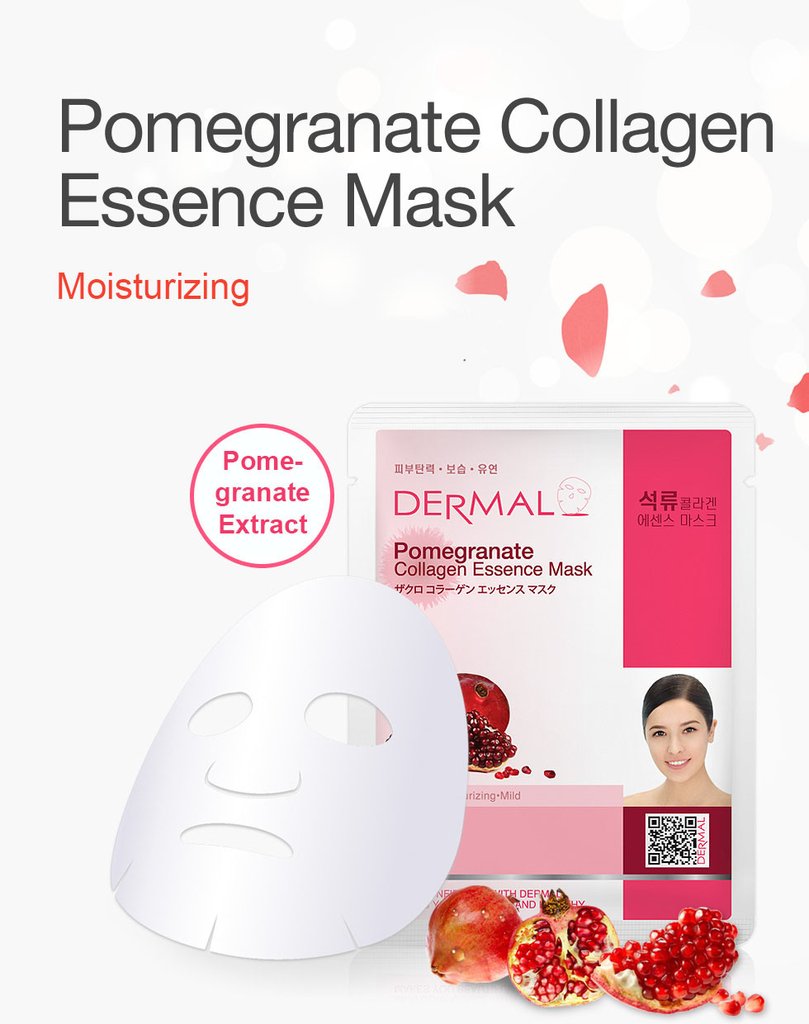 Dermal Pomegranate Collagen Essence Mask inneholder 1 % granatepleekstrakt, rik på antioksidanter som vitamin C, proanthocyanidiner og flavonoider, som effektivt forhindrer fine linjer og gir huden din et ungdommelig utseende.
